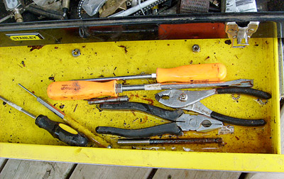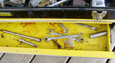 ![]() The toolbox was tipped on it's side and the water drained out. This is the top drawer of the tool box 2 weeks after the water has now gone down. The drill bits are rusted but the hand tools are not, since they were treated with StrongArm Brand back in 2004 - FOUR YEARS AGO! There's still some water in the bottom of the drawer. |