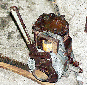 This engine was removed from a drain ditch where it laid as you see it for many years. The crankcase was nearly full of water. It was taken apart at one time and was put down in a yard as parts were moved, where it was forgotten. It finally rolled into a ditch and had grass growing all around it. |