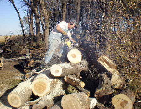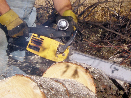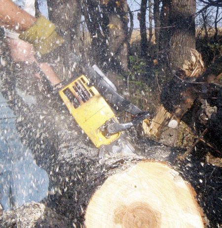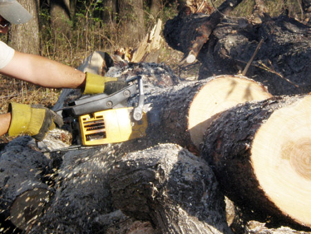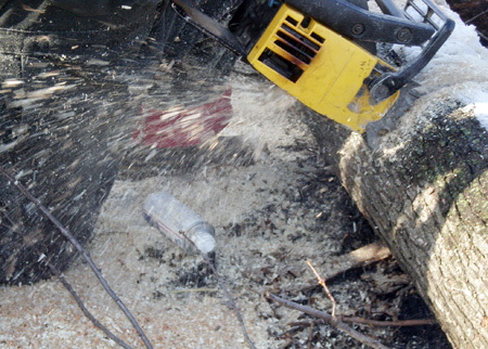 The performance of the saw and quality of the cut can be determined by the sawdust and shavings that come out from the machine. Nice large shavings from a sharp chain, and an even flow from the saw maintaining speed and not binding as it proceeds through the cut. IF the chain and bar go dry, the material will not come out like this, and will come out as a powder that just falls to the ground in a pile below the log at the cut. |