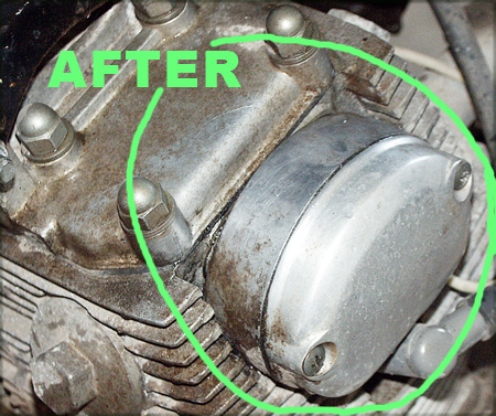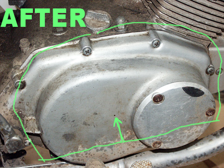 ![]() With just a small amount of USA Fluid Sprayed onto the upper area of the head, the corrosion on the aluminum is immediately erased on those areas. The entire upper part of the head is now no longer oxidized. The are in the green circle was lightly brushed for several seconds with a regular wire brush, with only several ounces of pressure. The area is then wiped and buffed with a clean dry rag, and the aluminum is restored and will remain in this condition for several years on the road and for a decade on a bike that's put away in storage with a collection. |
