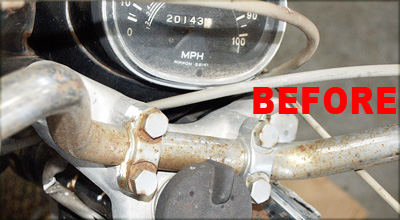 ![]() The handlebars After USA Fluid and several seconds of light brushing. The chrome and hardware is restored and intact for usage and preservation. NOTE also, the before and after on the headlight nut and hardware. The right side outlined in red is the way the left outlined in green side looked before wetting with several drops of USA Fluid and several seconds of light brushing. More pictures of of them are shown below also. |