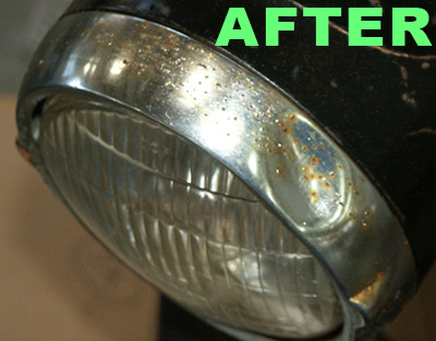 ![]() Close-up of the headlight ring After applying USA Fluid and some light brushing. All of the rust around the areas where pitting has started through the chrome are cleaned, and the USA Fluid is now into the pitted spots, and will prevent any further rusting and growth of the pitting from this point on. |