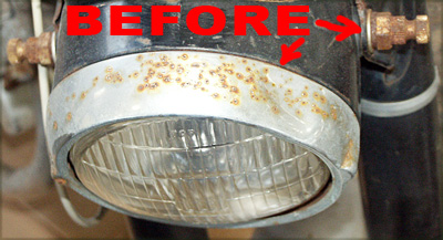 ![]() This is the ratty before condition of the headlight chrome ring that's rusted and pitting; and also shown is the nut assemblies on the sides of the headlight. |