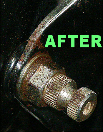 ![]() Here's the same nut only a half minute later, after wetting it with USA Fluid and running a hand wire brush over it for a few seconds. The bottled muscle in USA Fluid has instantly gone below the corrosion and rust, and it will stay like this now, and can be worked further and detailed and rest of the rust brushed out. |