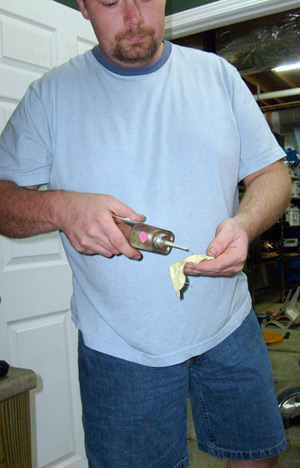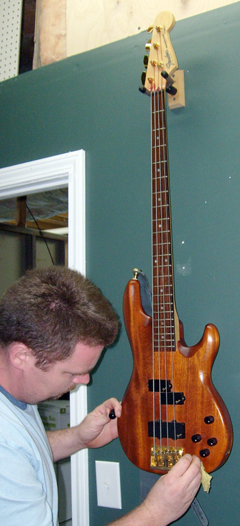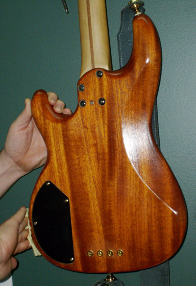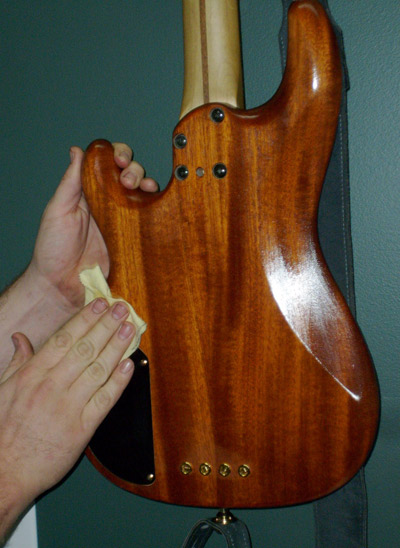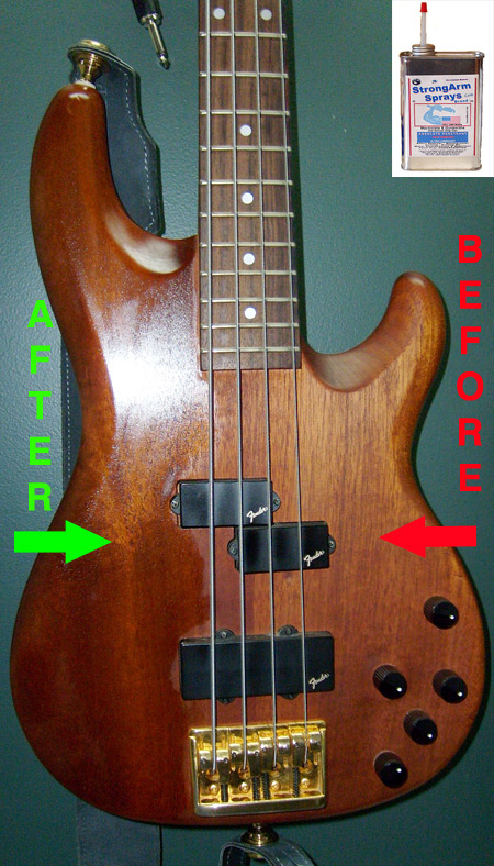 ![]() Shown here is the rear of the bass being treated with USA Fluid. The richness of the wood finish is instantly brought back up as StrongArm is wiped on with the small rag. |