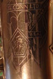 ![]() The surface of the 'Lady Face' is well rubbed and oxidized on this sax The brass is marked from the many years of use and oxidized from a half century of storage. |