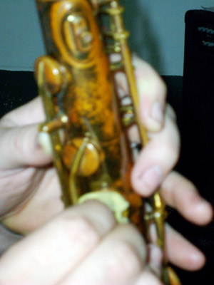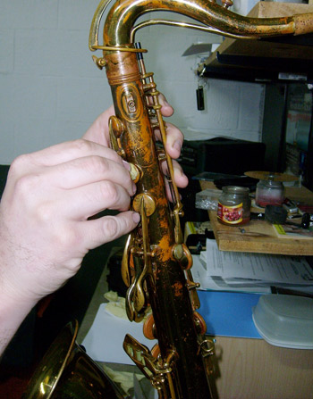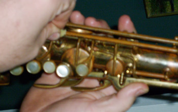 ![]() These pictures show detail of the wiping onto the body of the sax, working the various flaps and keys which produce the sweet sound of these antique instruments. |