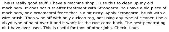 department... "I just used half of a 4 oz bottle of the Strong Arm Brand to clean my whole bike...GREAT STUFF ...very little elbow grease needed, and rusty spots on chrome... gone, pits in lowers look great... even cleans off paint, once again great stuff thanks." Thank you Jay Borowy Harley Tech J&P Cycles, Inc. Daytona Florida Facility |